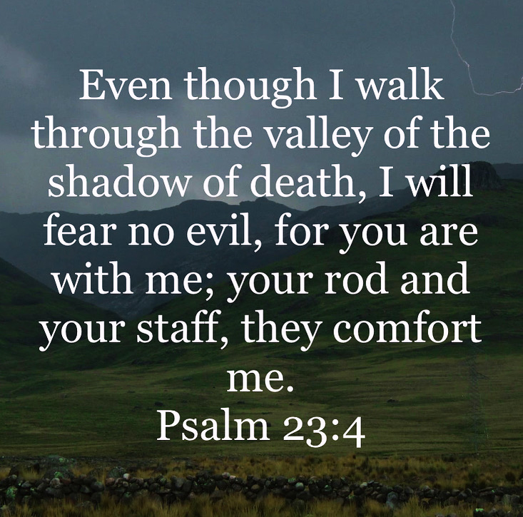 Even though I walk through the valley of the shadow of death, I will fear no evil, for you are with me; your rod and your staff, they comfort me.