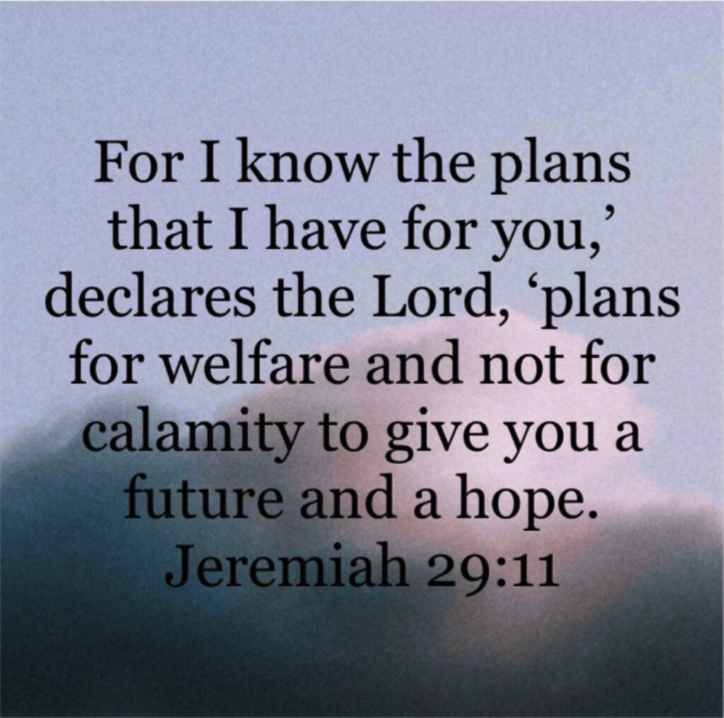 “For I know the plans that I have for you,” declares the Lord, “plans for welfare and not for calamity to give you a future and a hope. Then you will call upon Me and come and pray to Me, and I will listen to you. You will seek Me and find Me when you search for Me with all your heart.”