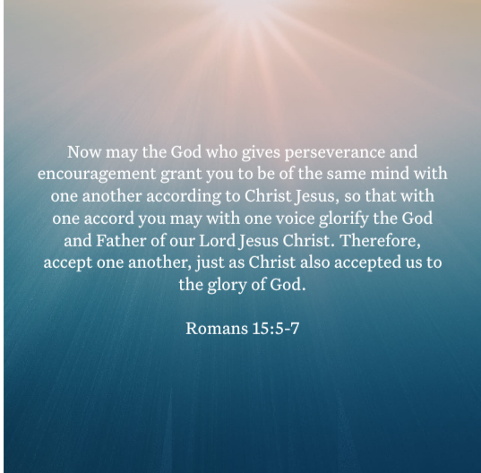 Now may the God who gives perseverance and encouragement grant you to be of the same mind with one another according to Christ Jesus, so that with one accord you may with one voice glorify the God and Father of our Lord Jesus Christ. Therefore, accept one another, just as Christ also accepted us to the glory of God.