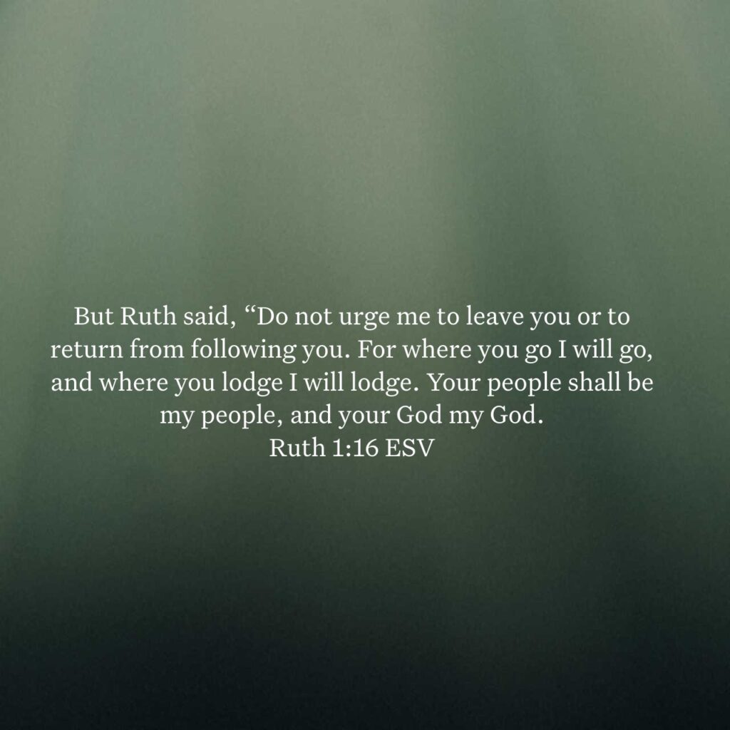 But Ruth said, “Do not urge me to leave you or to return from following you. For where you go I will go, and where you lodge I will lodge. Your people shall be my people, and your God my God.”