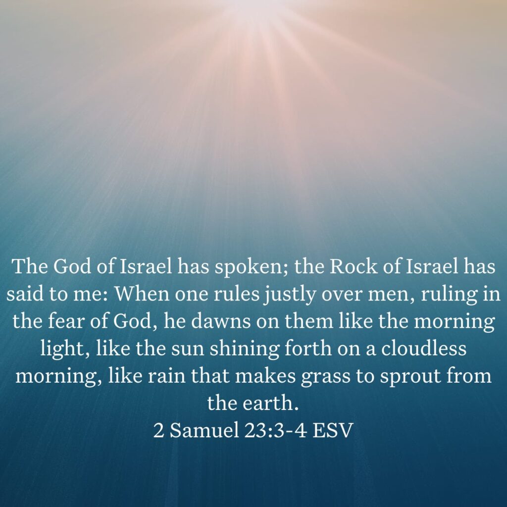 The God of Israel has spoken; the Rock of Israel has said to me: When one rules justly over men, ruling in the fear of God, he dawns on them like the morning light, like the sun shining forth on a cloudless morning, like rain that makes grass to sprout from the earth.